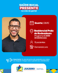 08/10 – Quarta-feira – Residencial Praia do Rodeadouro (Programa Sorrir Residenciais). 15 pacientes por demanda livre;
