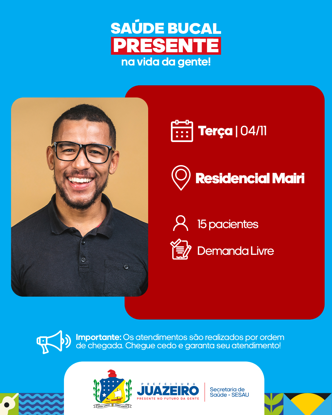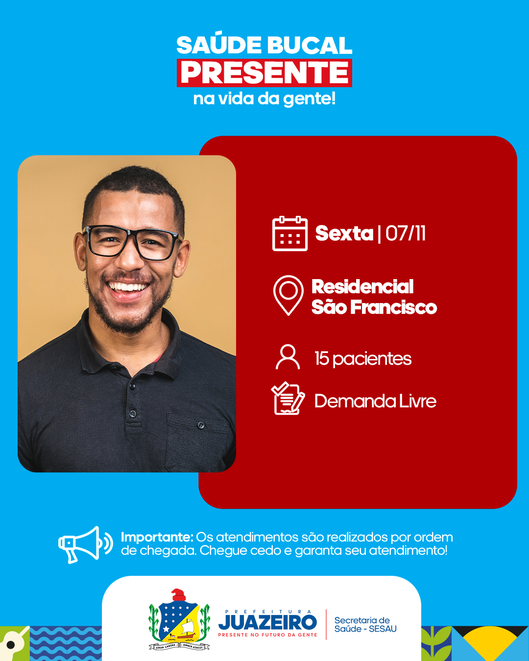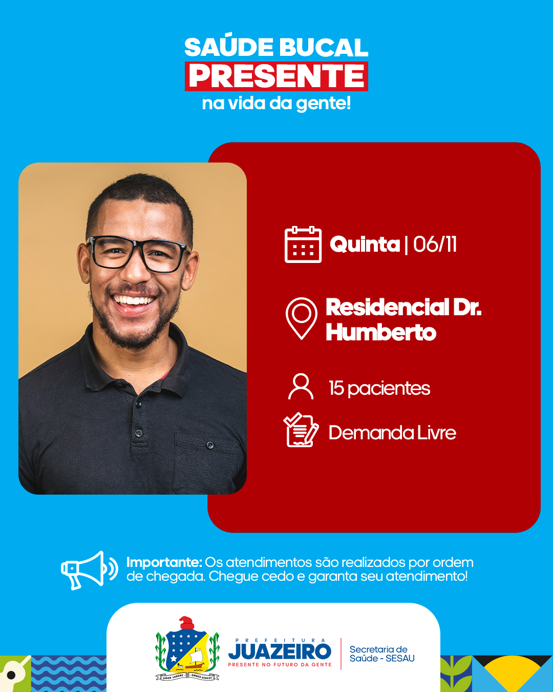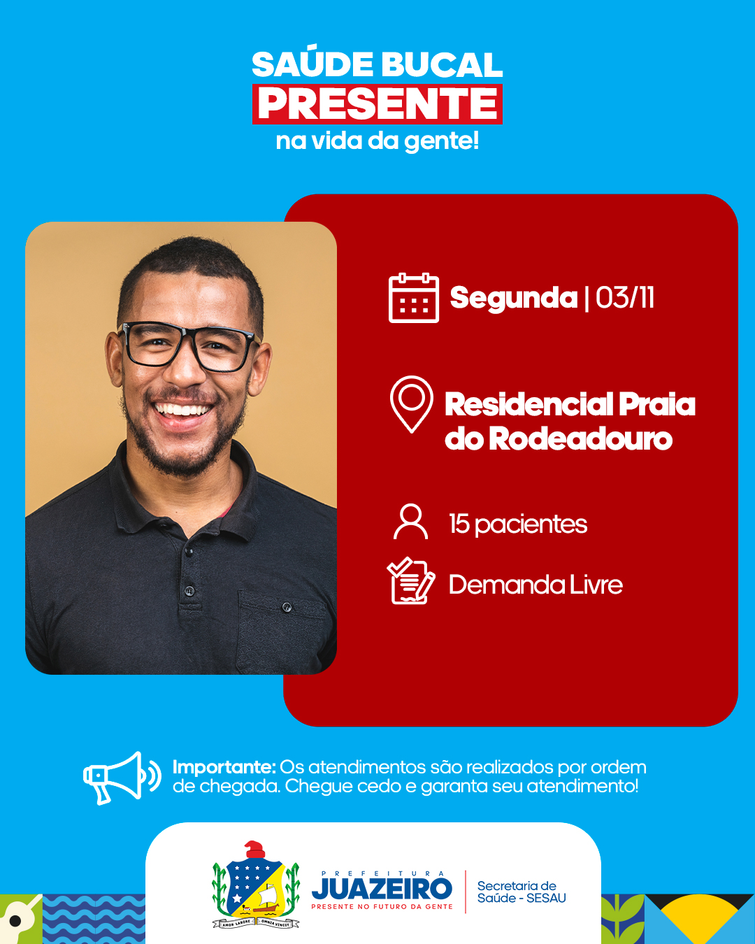 A Unidade de Atendimento Odontológico Móvel (UOM) segue levando serviços para a população. A iniciativa realizada pela Prefeitura de Juazeiro, por meio da Secretaria Municipal de Saúde (Sesau), está oferecendo, entre os dias 3 e 7 de novembro, 15 atendimentos diários a partir das 8h. É necessário que os pacientes apresentem RG, CPF e Cartão SUS.