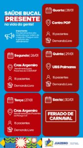 A Unidade de Atendimento Odontológico Móvel (UOM) segue levando serviços para a população. A iniciativa realizada pela Prefeitura de Juazeiro, por meio da Secretaria Municipal de Saúde (Sesau), está oferecendo, entre os dias 26 e 29 de janeiro, 15 atendimentos diários a partir das 8h. É necessário que os pacientes apresentem RG, CPF e Cartão SUS.