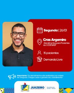 26/01– Segunda-feira – CRAS Argemiro (Atendimento para pacientes da Codevasf). 15 pacientes por demanda livre;