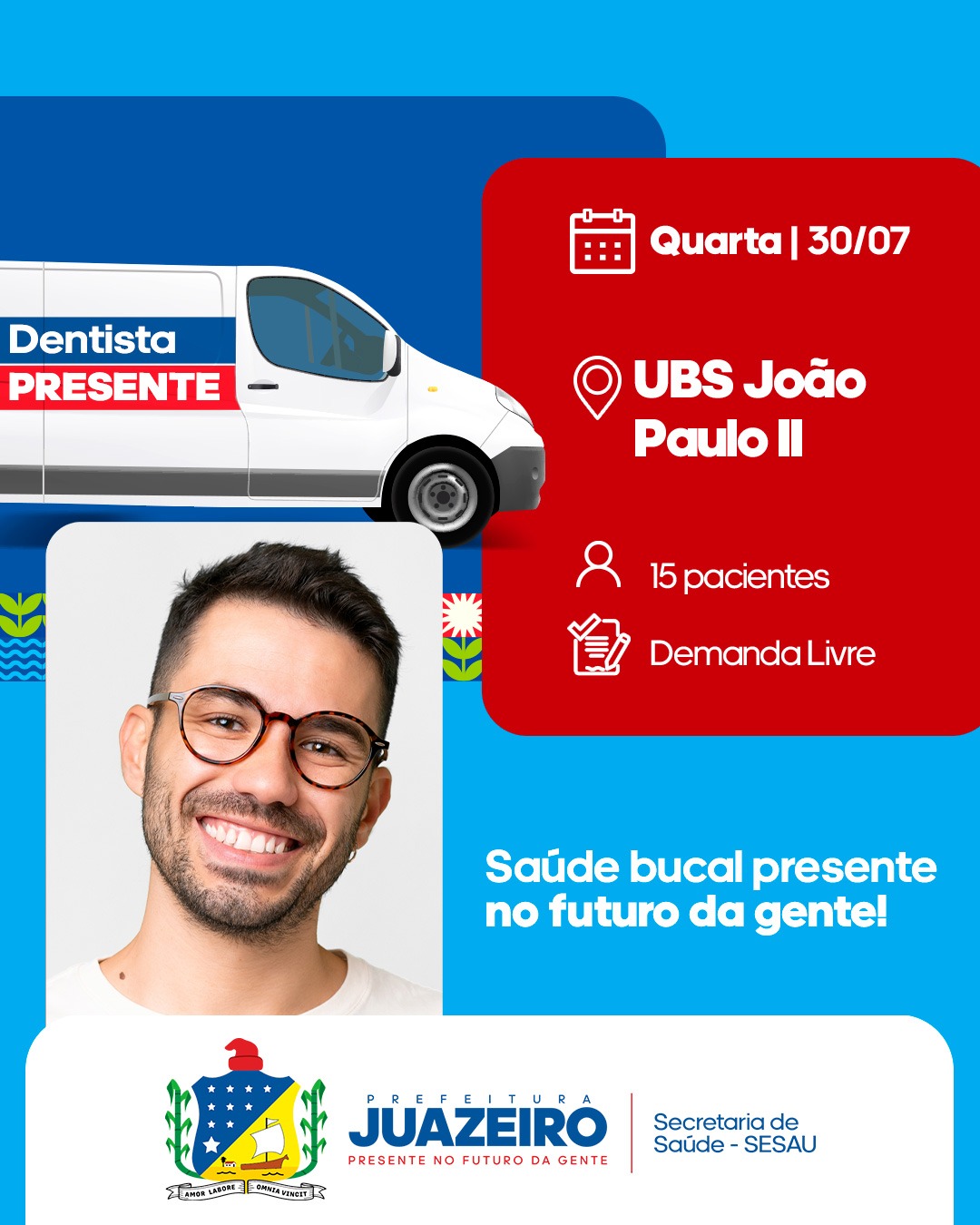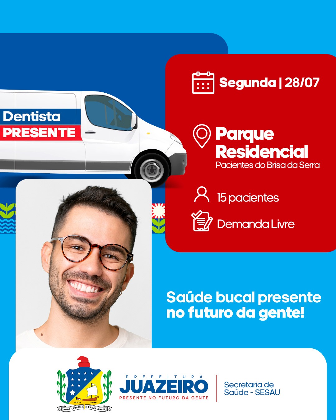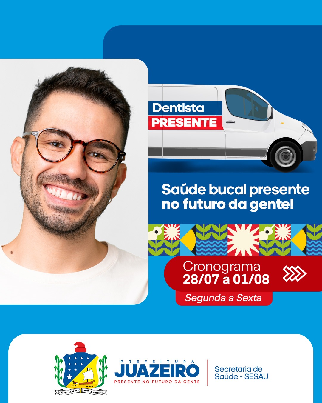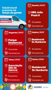 A Prefeitura de Juazeiro, por meio da Secretaria de Saúde (Sesau), segue reforçando o compromisso com o acesso à saúde bucal e a ampliação dos atendimentos em todas as regiões do município. Nesta semana, de 28 de julho a 1º de agosto, a Unidade Móvel de Atendimento Odontológico estará presente em cinco localidades diferentes, facilitando o cuidado com a saúde bucal para quem mais precisa.