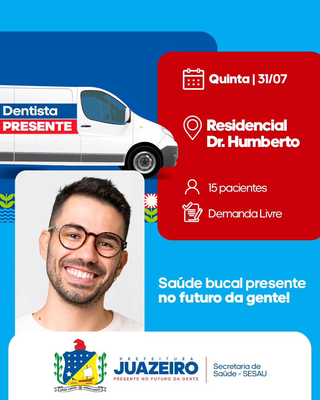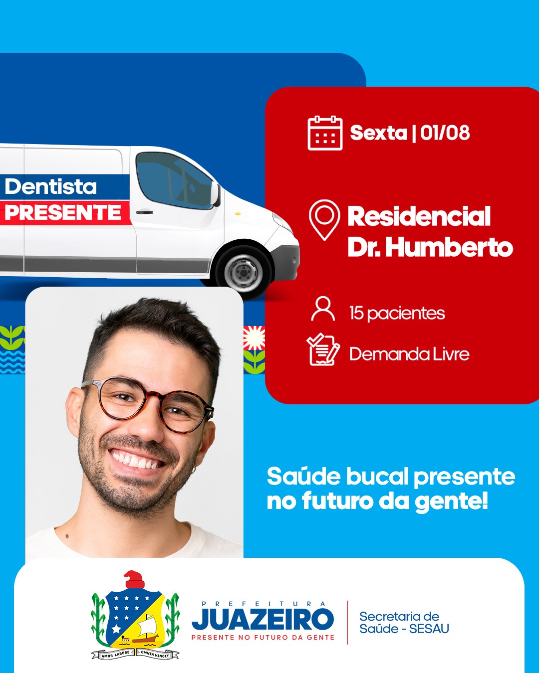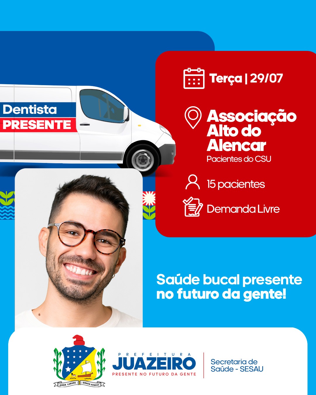 A Prefeitura de Juazeiro, por meio da Secretaria de Saúde (Sesau), segue reforçando o compromisso com o acesso à saúde bucal e a ampliação dos atendimentos em todas as regiões do município. Nesta semana, de 28 de julho a 1º de agosto, a Unidade Móvel de Atendimento Odontológico estará presente em cinco localidades diferentes, facilitando o cuidado com a saúde bucal para quem mais precisa.
