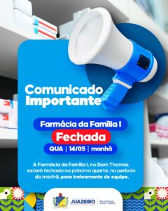 A Secretaria de Saúde de Juazeiro/SESAU informa à população que, excepcionalmente na próxima quarta-feira (14), a Farmácia da Família I, localizada no bairro Dom Thomaz, estará fechada no período da manhã para a realização de treinamento da equipe de colaboradores.