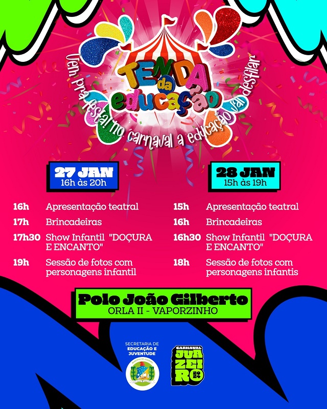 Repetindo o sucesso das edições anteriores, as ‘Tendas da Educação’, da Prefeitura de Juazeiro, através da Secretaria de Educação e Juventude (Seduc), estarão de volta para abrilhantar ainda mais a folia durante os festejos do ‘Carnaval de Juazeiro 2024. Com estrutura completa montada no Polo João Gilberto (Orla II), o espaço kids vai dispor de uma programação no sábado (27), das 16h às 20h, e no domingo (28), das 15h às 19h, gratuitamente.