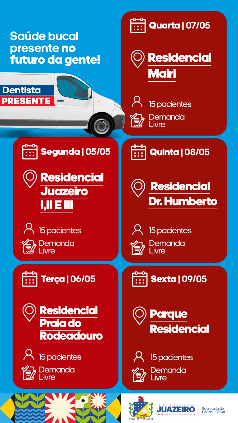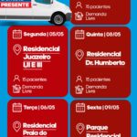 – 05/05 – Segunda-feira – Residencial Juazeiro I, II e III. Atendimento por demanda livre (15 pacientes);